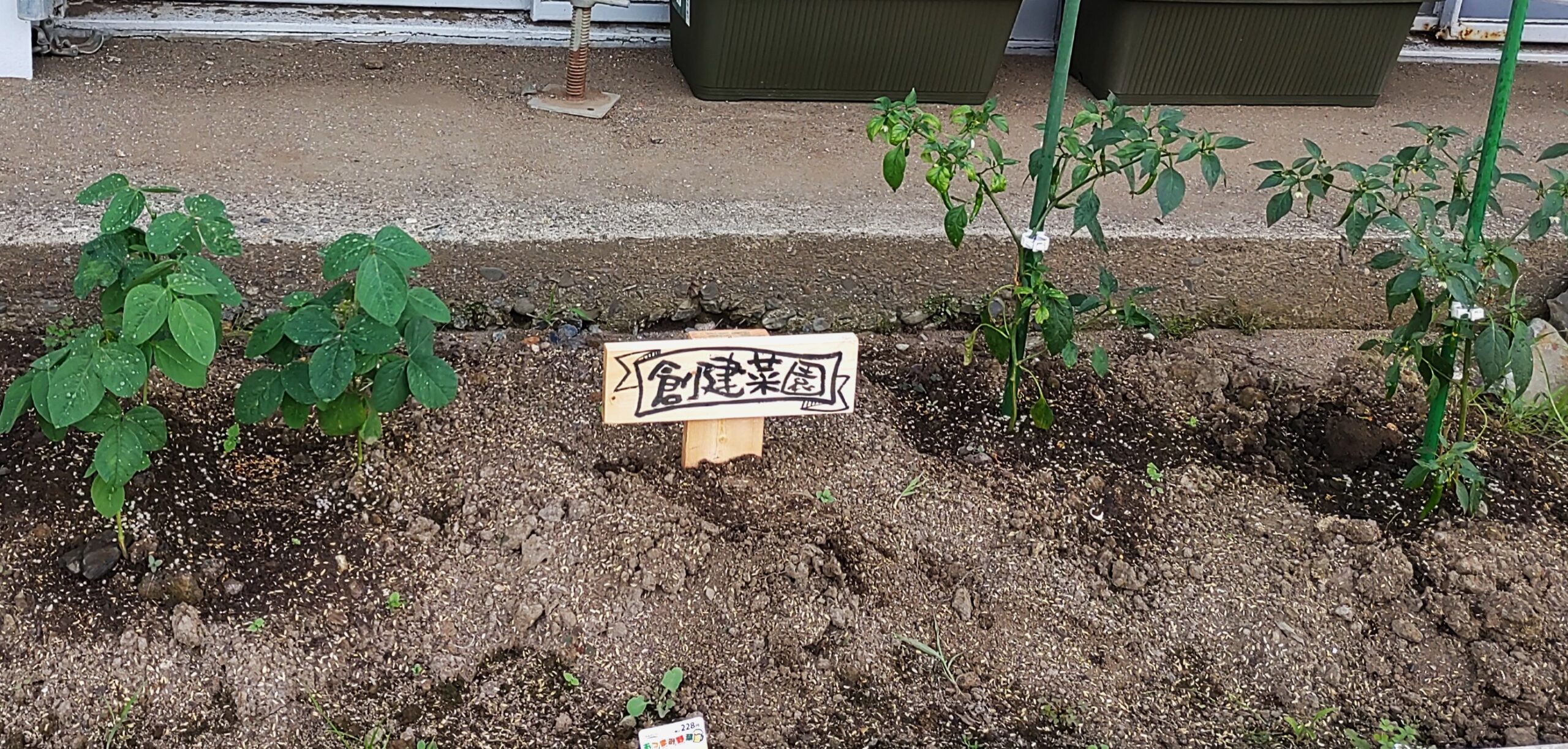 自宅にあった板に「創建菜園」と書き花壇に設置。